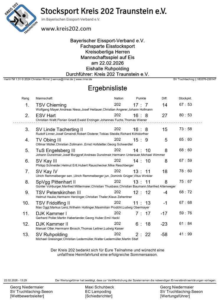 Am 22. Februar 2025 wurde in Ruhpolding die Meisterschaft der Kreisoberliga ausgetragen. Insgesamt nahmen 13 Mannschaften an diesem Wettbewerb teil.