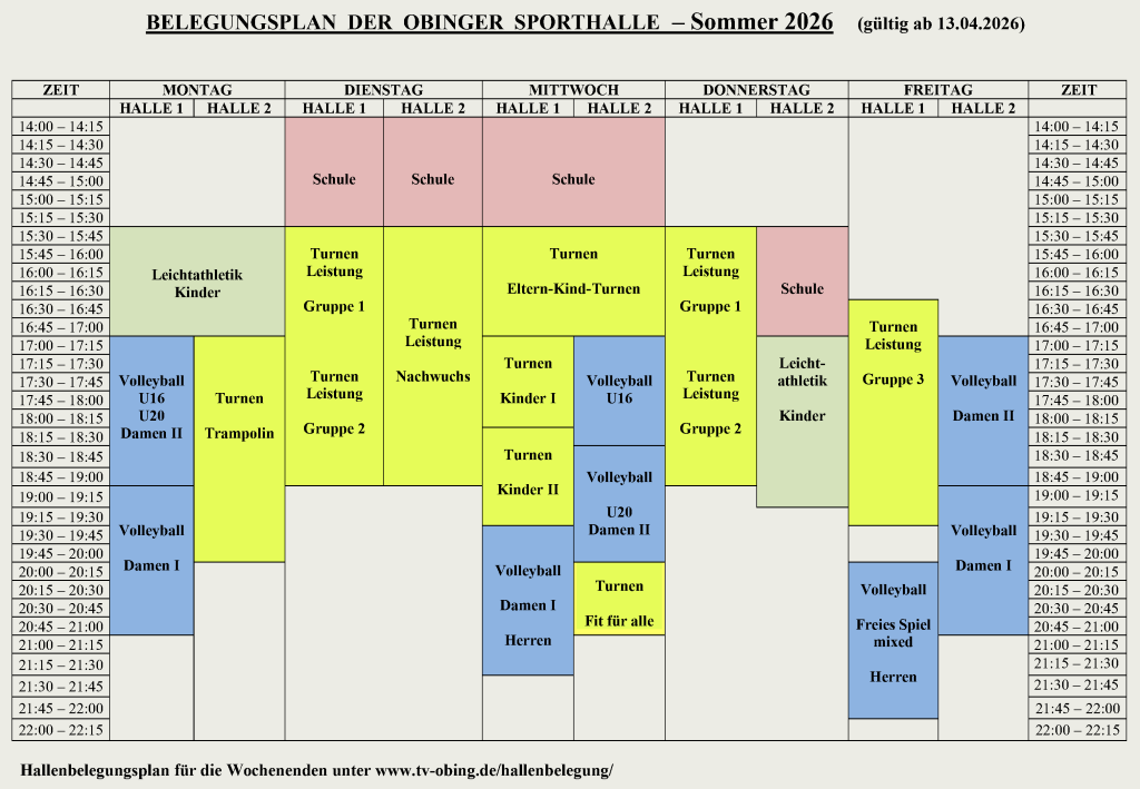 | Sa | 25.07.2026 | 8:00 Uhr | evtl. TV Obing - Turnen Bezirksliga (Halle 1+2) | |