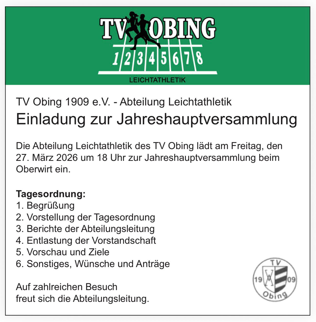 Anfragen und Informationen: Simone Koenig – Leichtathletik@tv-obing.de – Tel. +49 151 70640017