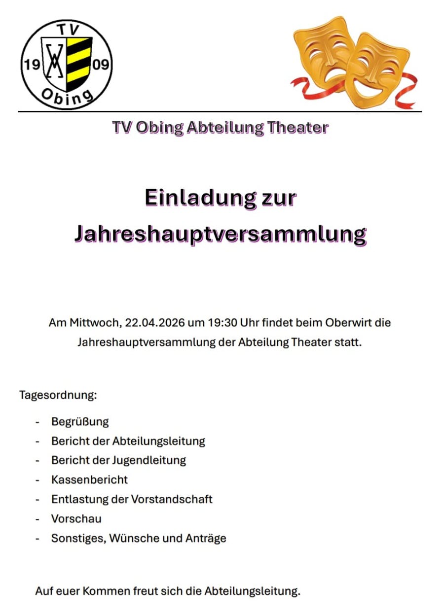 Die Theatergruppe im TV Obing bietet zukünftig einen Theaterstammtisch an. Termin ist jeder dritte Donnerstag im Monat um 20 Uhr. Die Termine stehen jeweils im Vereins-Terminplan.