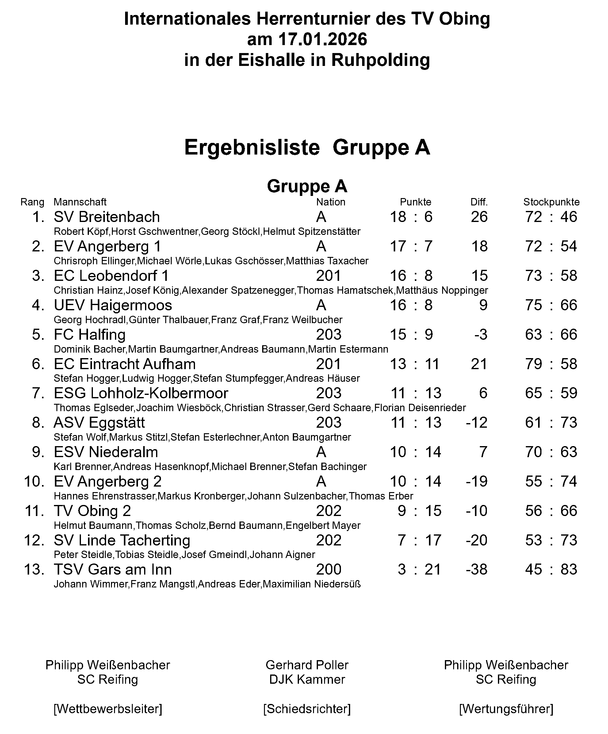 In Gruppe A setzte sich der SV Breitenbach A mit 18:6 Punkten an die Spitze, gefolgt vom EV Angerberg 1 A und dem EC Leobendorf 1. Die Mannschaft TV Obing 2 belegte mit 9:15 Punkten den 11. Rang in einer stark besetzten Gruppe.