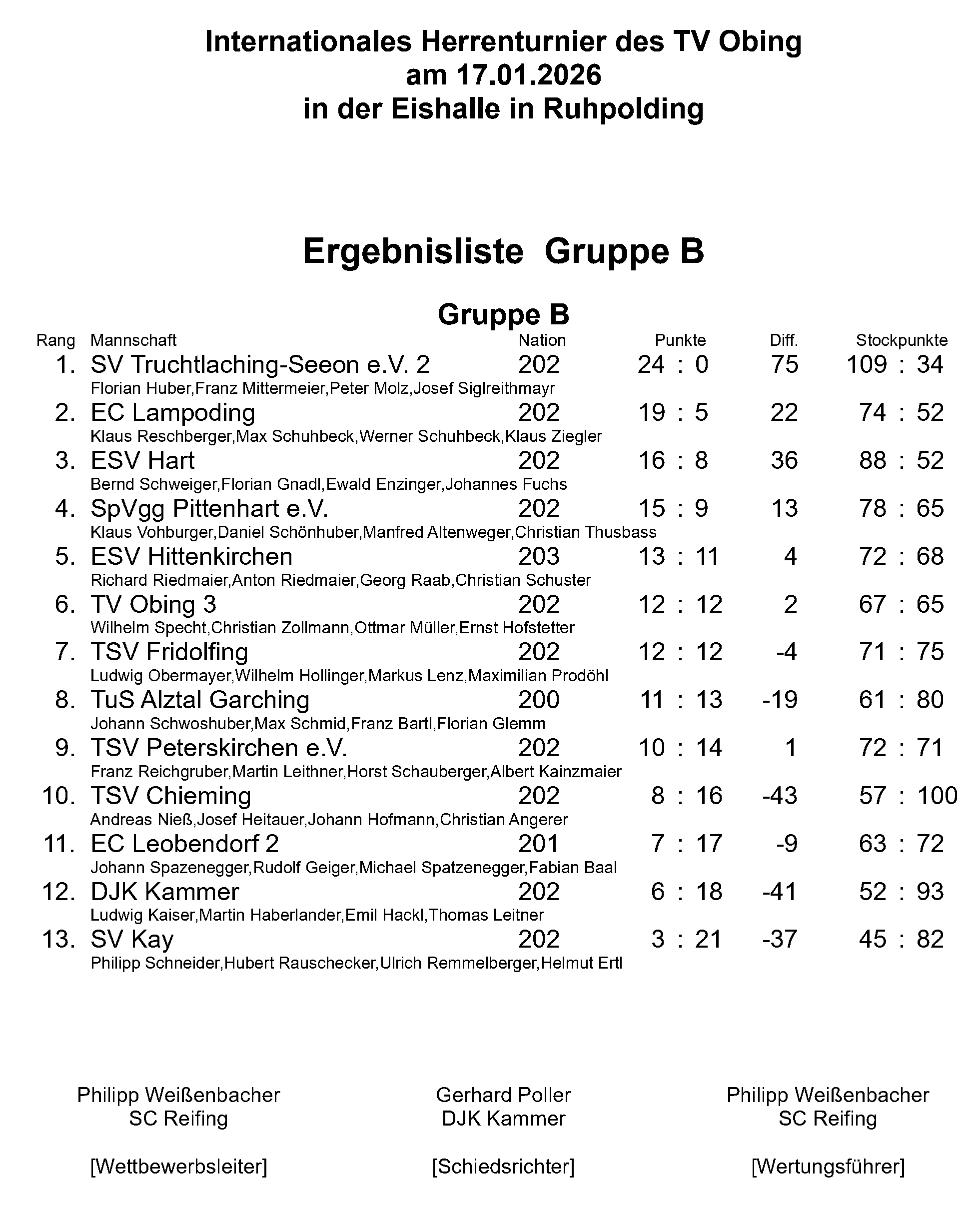 Die Gruppe B dominierte der SV Truchtlaching-Seeon e.V. 2, der das Turnier mit einer makellosen Bilanz von 24:0 Punkten gewann. Auf den weiteren Podestplätzen folgten EC Lampoding und ESV Hart. Das Team TV Obing 3 erreichte mit 12:12 Punkten einen soliden 6. Platz.