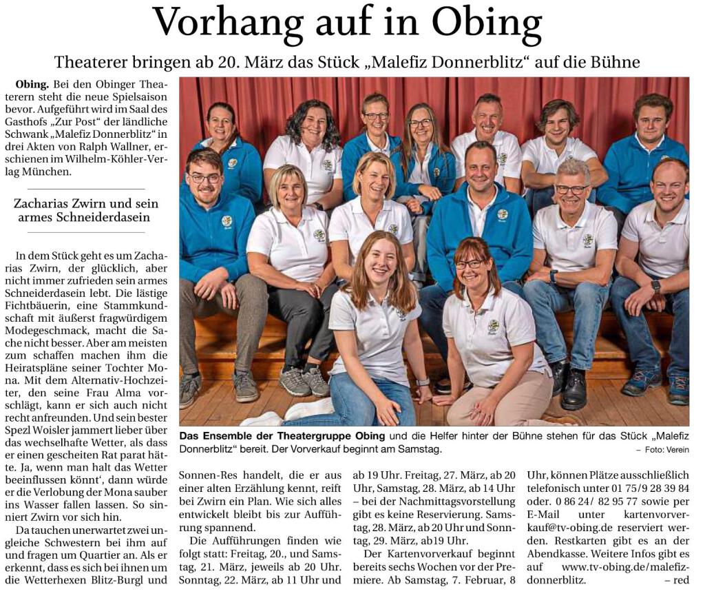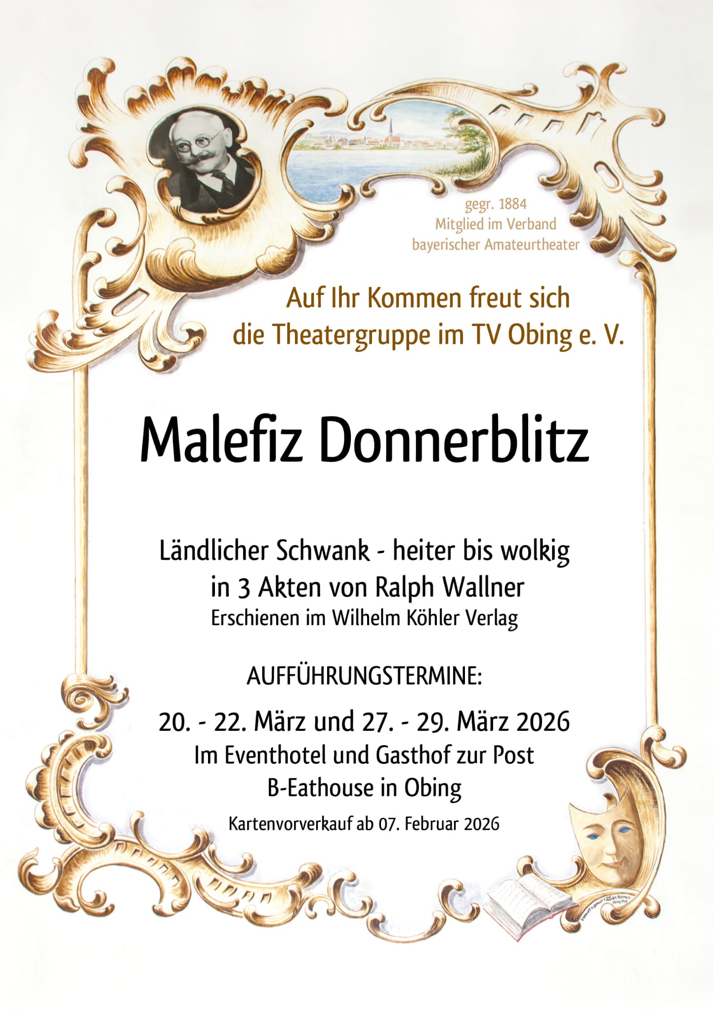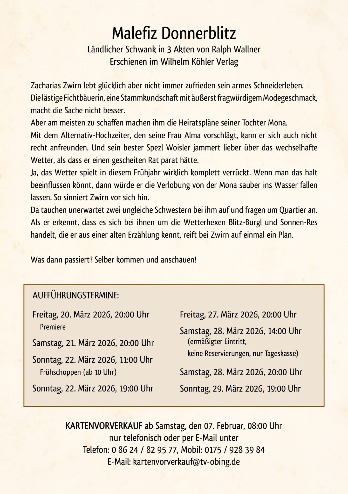 Im kommenden Theatersaison steht bei der Theatergruppe Obing im TV Obing, der Dreiakter „Malefiz Donnerblitz“ von Ralph Wallner (Wilhelm Köhler Verlag München) auf dem Spielplan.