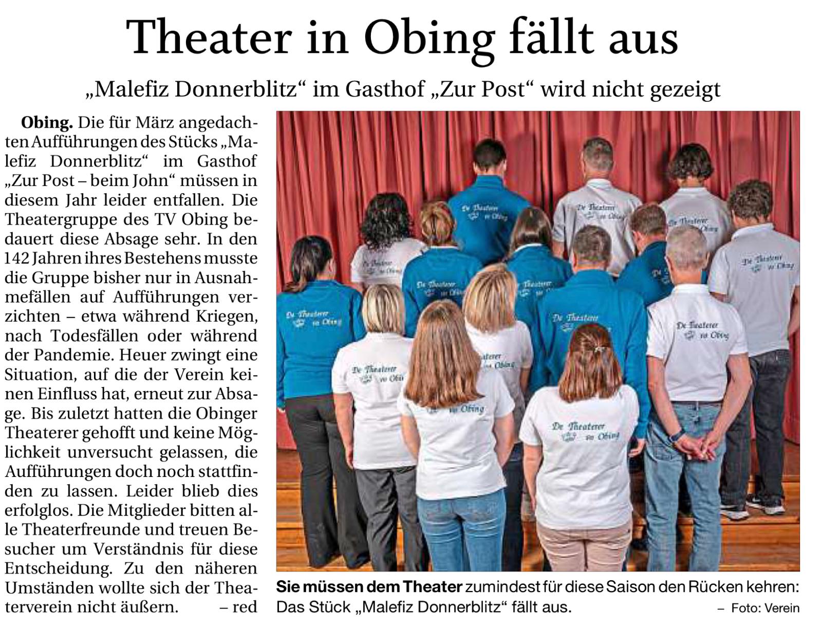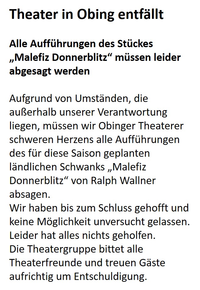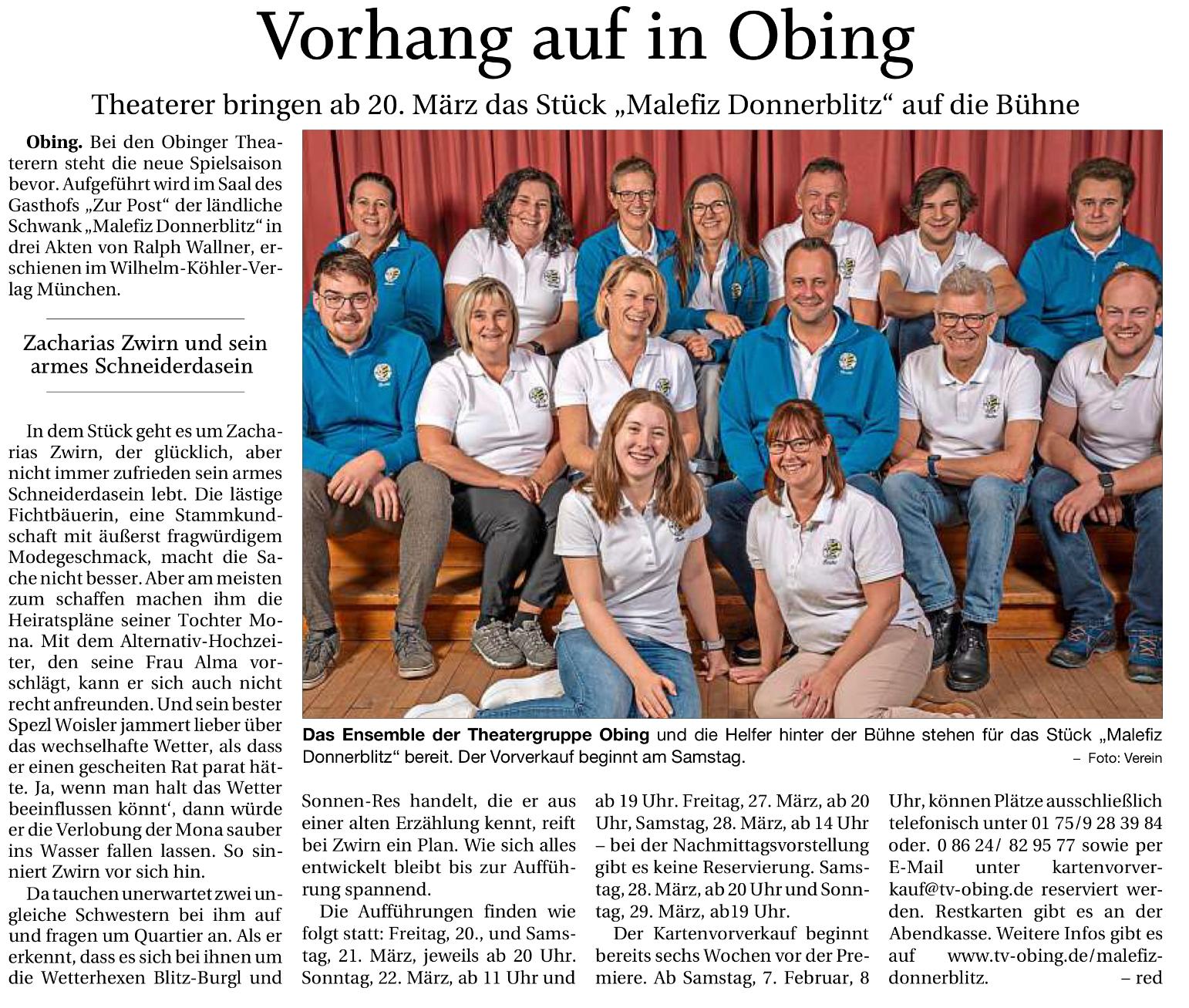 Im kommenden Theatersaison steht bei der Theatergruppe Obing im TV Obing, der Dreiakter „Malefiz Donnerblitz“ von Ralph Wallner (Wilhelm Köhler Verlag München) auf dem Spielplan.