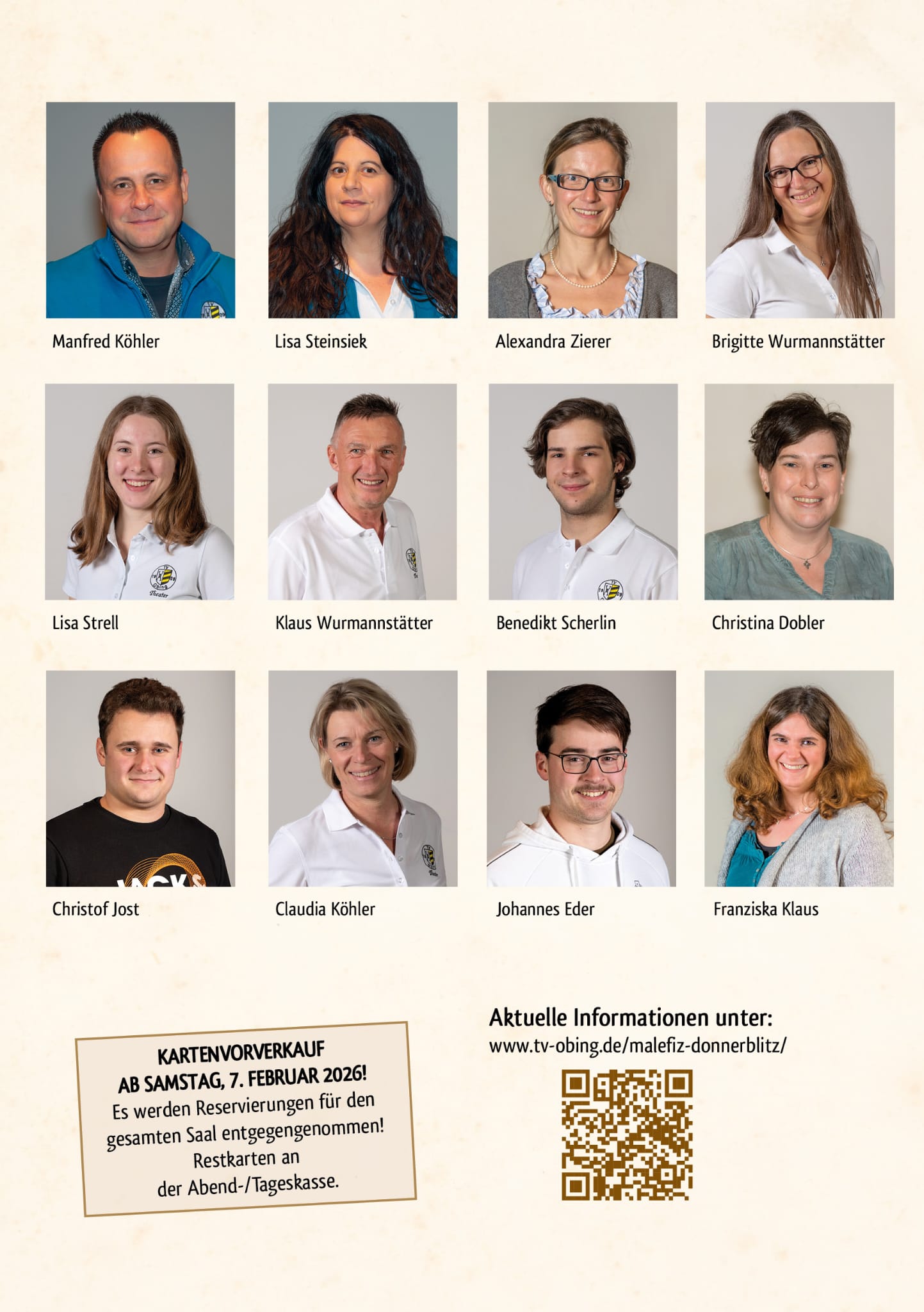 Neu! Der Kartenvorverkauf beginnt zwei Wochen früher, am 7. Februar 2026 um 08:00 Uhr. Nur telefonisch unter Mobil: 0175/9283984, Festnetz:08624/829577 oder per E-Mail: kartenvorverkauf@tv-obing.de.