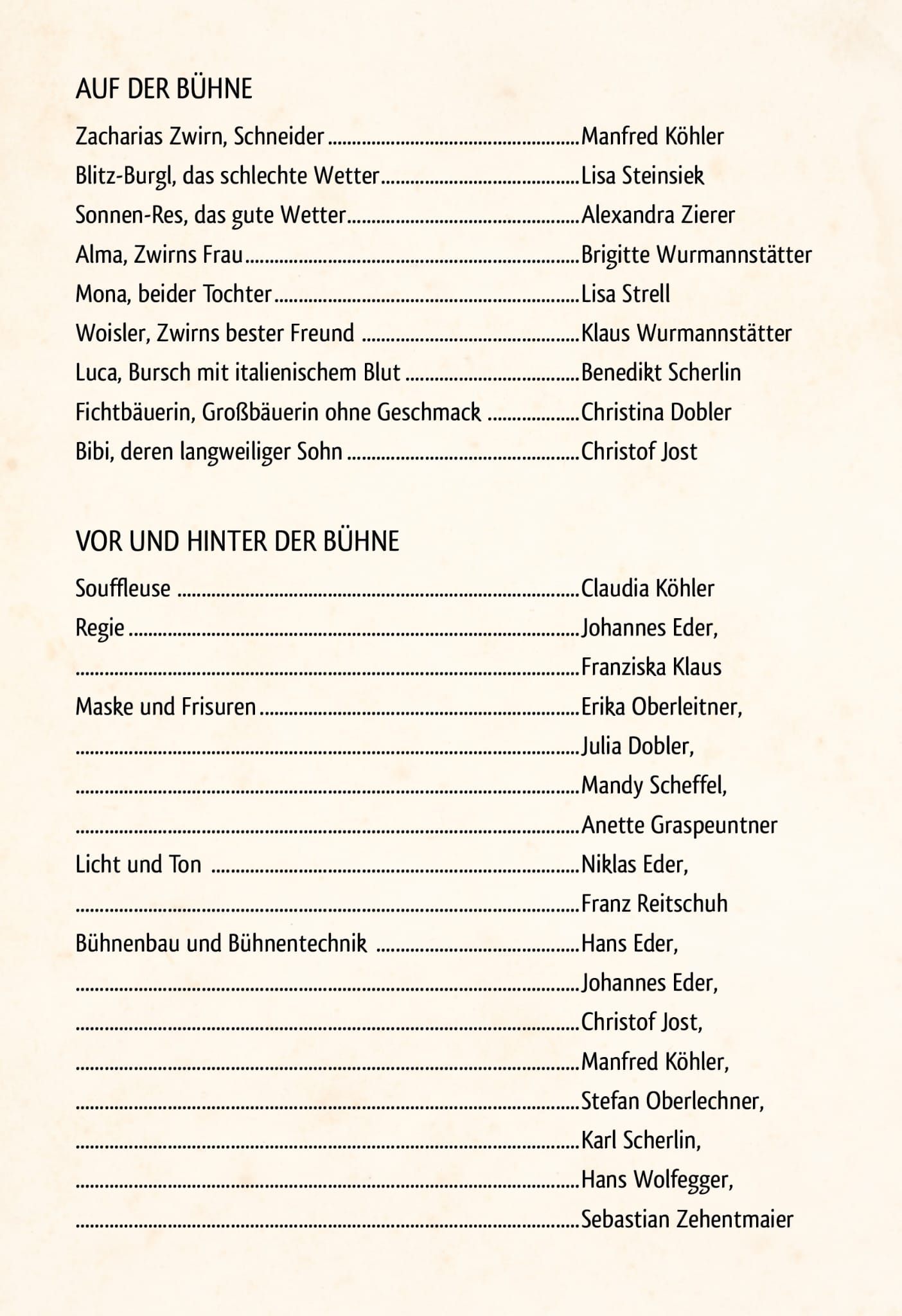 Zum Inhalt: Zacharias Zwirn lebt glücklich aber nicht immer zufrieden sein armes Schneiderleben. Die lästige Fichtbäuerin, eine Stammkundschaft mit äußerst fragwürdigem Modegeschmack, macht die Sache nicht besser. Aber am meisten zum Schaffen machen ihm die Heiratspläne seiner Tochter Mona. Mit dem Alternativ-Hochzeiter, den seine Frau Alma vorschlägt, kann er sich auch nicht recht anfreunden. Und sein bester Spezl Woisler jammert lieber über das wechselhafte Wetter, als dass er einen gescheiten Rat parat hätte. Ja, wenn man halt das Wetter beeinflussen könnt, dann würde er die Verlobung sauber ins Wasser fallen lassen. So sinniert Zwirn vor sich hin. Da tauchen unerwartet zwei ungleiche Schwestern bei ihm auf und fragen um Quartier an. Als er erkennt, dass es sich bei ihnen um die Wetterhexen Blitz-Burgl und Sonnen-Res handelt, die er aus einer alten Erzählung kennt, reift bei Zwirn auf einmal ein Plan.