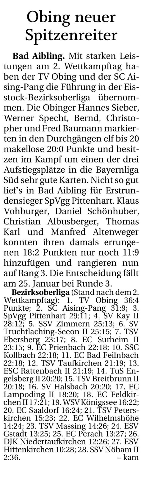 Bad Aibling. Mit starken Leistungen am 2. Wettkampftag haben der TV Obing und der SC Aising-Pang die Führung in der Eisstock-Bezirksoberliga übernommen. Die Obinger Hannes Sieber, Werner Specht, Bernd, Christopher und Fred Baumann markierten in den Durchgängen elf bis 20 makellose 20:0 Punkte und besitzen im Kampf um einen der drei Aufstiegsplätze in die Bayernliga Süd sehr gute Karten. Nicht so gut lief’s in Bad Aibling für Erstrundensieger SpVgg Pittenhart. Klaus Vohburger, Daniel Schönhuber, Christian Albusberger, Thomas Karl und Manfred Altenweger konnten ihren damals errungenen 18:2 Punkten nur noch 11:9 hinzufügen und rangieren nun auf Rang 3. Die Entscheidung fällt am 25. Januar bei Runde 3.