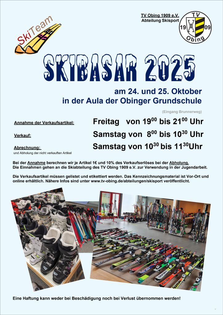 Wie jedes Jahr veranstaltet die Abteilung Skisport des TV Obing 1909 e.V. wieder einen Ski-Basar, bei dem jeder seine gebrauchten Wintersport-Artikel verkaufen kann.